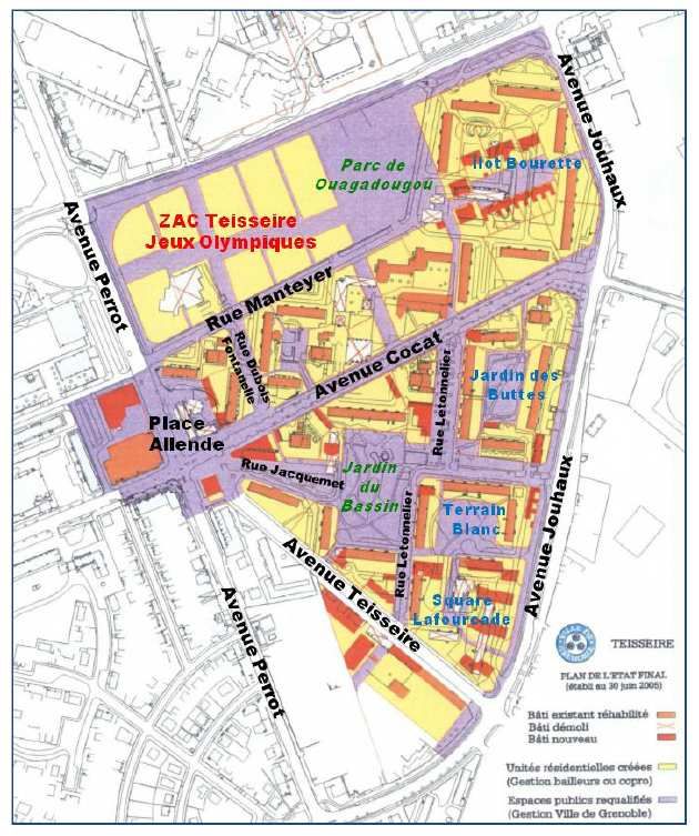 Dans le détail, cela donne une redistribution complète du foncier en différenciant le domaine public (rues, places, squares, jardins publics) et le domaine privé (espace privatif autour des immeubles, concept d'unité résidentielle),la requalification des raccordements aux artères de la ville et des points d'entrée du quartier par la création d'une place à l'intersection des voies Jean Perrot/Malherbe/Cocat et un programme de démolition limité (<100) compensé par la construction de petits programmes pour un nombre de logements identique.
