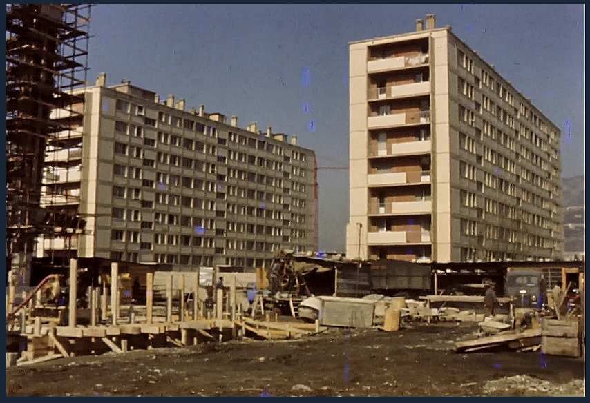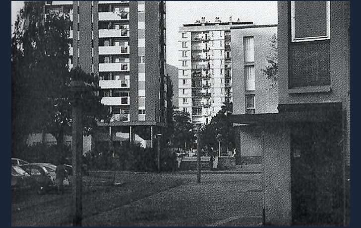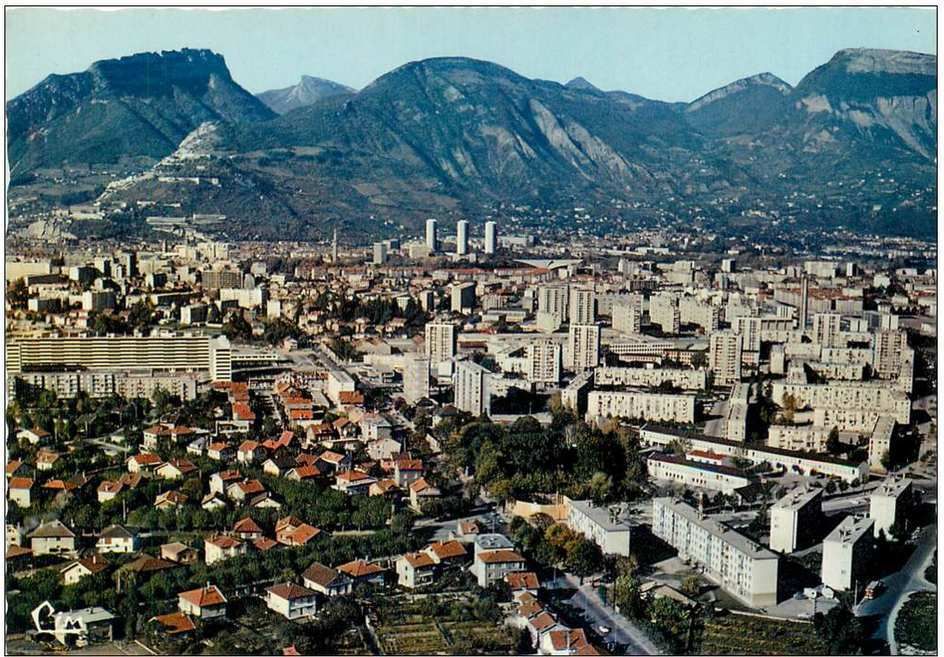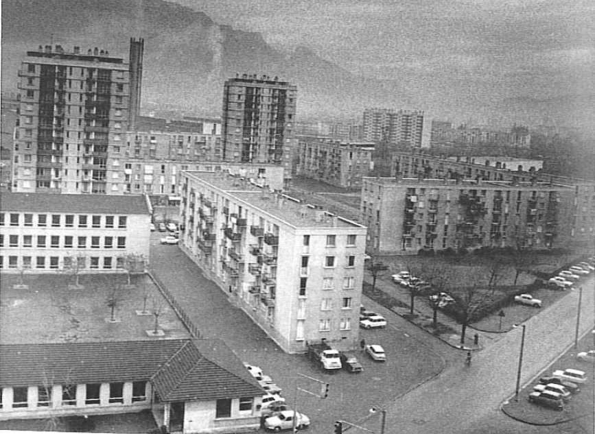 Ce quartier (Ensemble de bâtiments blancs à droite) est situé au sud -Est de Grenoble à la limite de St Martin d'Hères. A gauche , l'ensemble de villas est le quartier expérimental de la caisse d'épargne