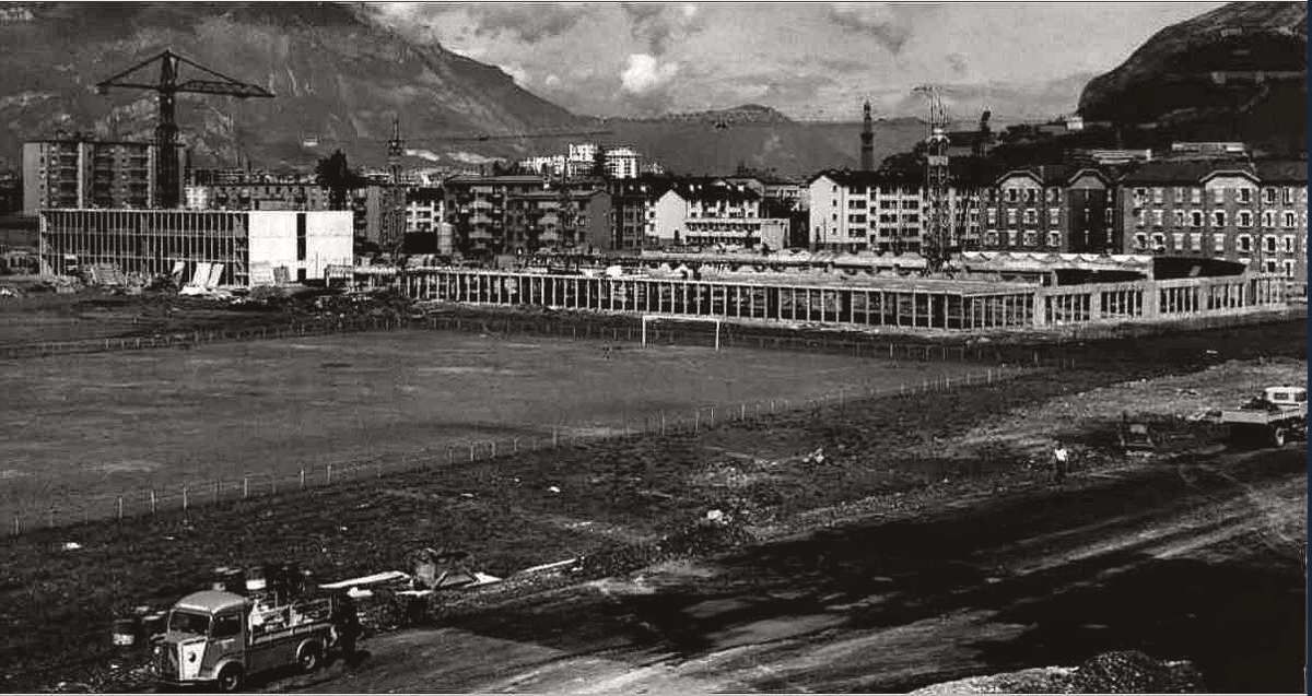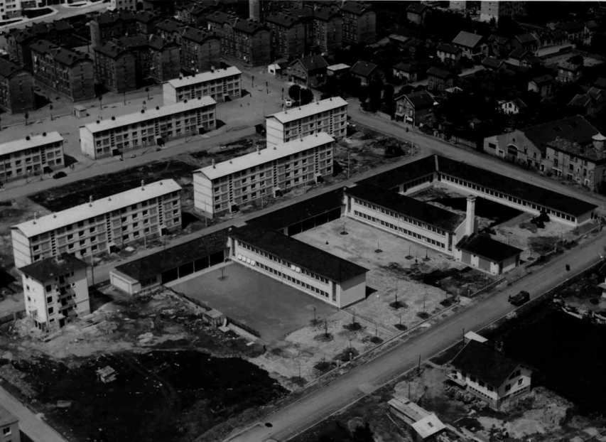 Vue aérienne en 1956 . Au centre les batiments Moyrand. Au sud , encore des champs (Bibliothèque municipale de Grenoble)