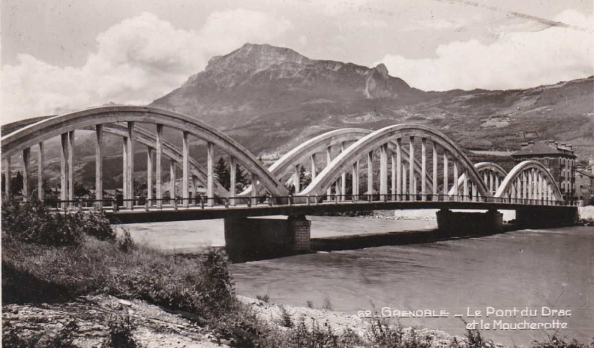 Pont aux arches Fontaine- Grenoble sur le Drac ( Il remplace l'ancien pont suspendu depuis 1937 et été détruit par les allemands en 1944. Il a été reconstruit après 1945. Depuis 1987, les voitures ont été remplacées par les tramways de la ligne A.)