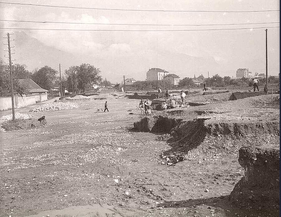 Erasement vers 1932 des remparts entre le parc Paul Mistral et le chemin d'Echirolles (Avenue de Stalingrad). Au loin la tour Perret