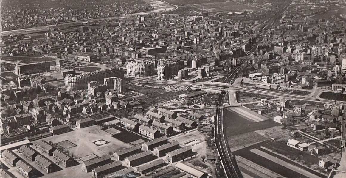 Début des années 50, la prairie, quoique largement grignotée est encore là. La ligne de chemin de fer sépare à gauche la caserne Reyniès-Bayard et à droite le quartier de la Capuche